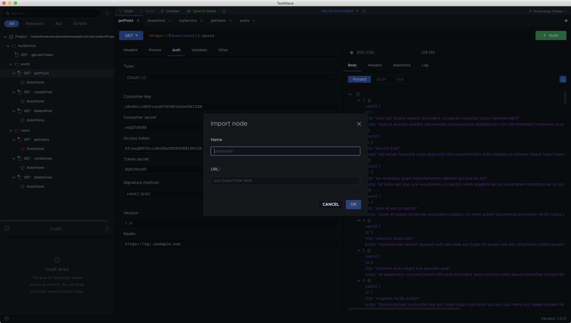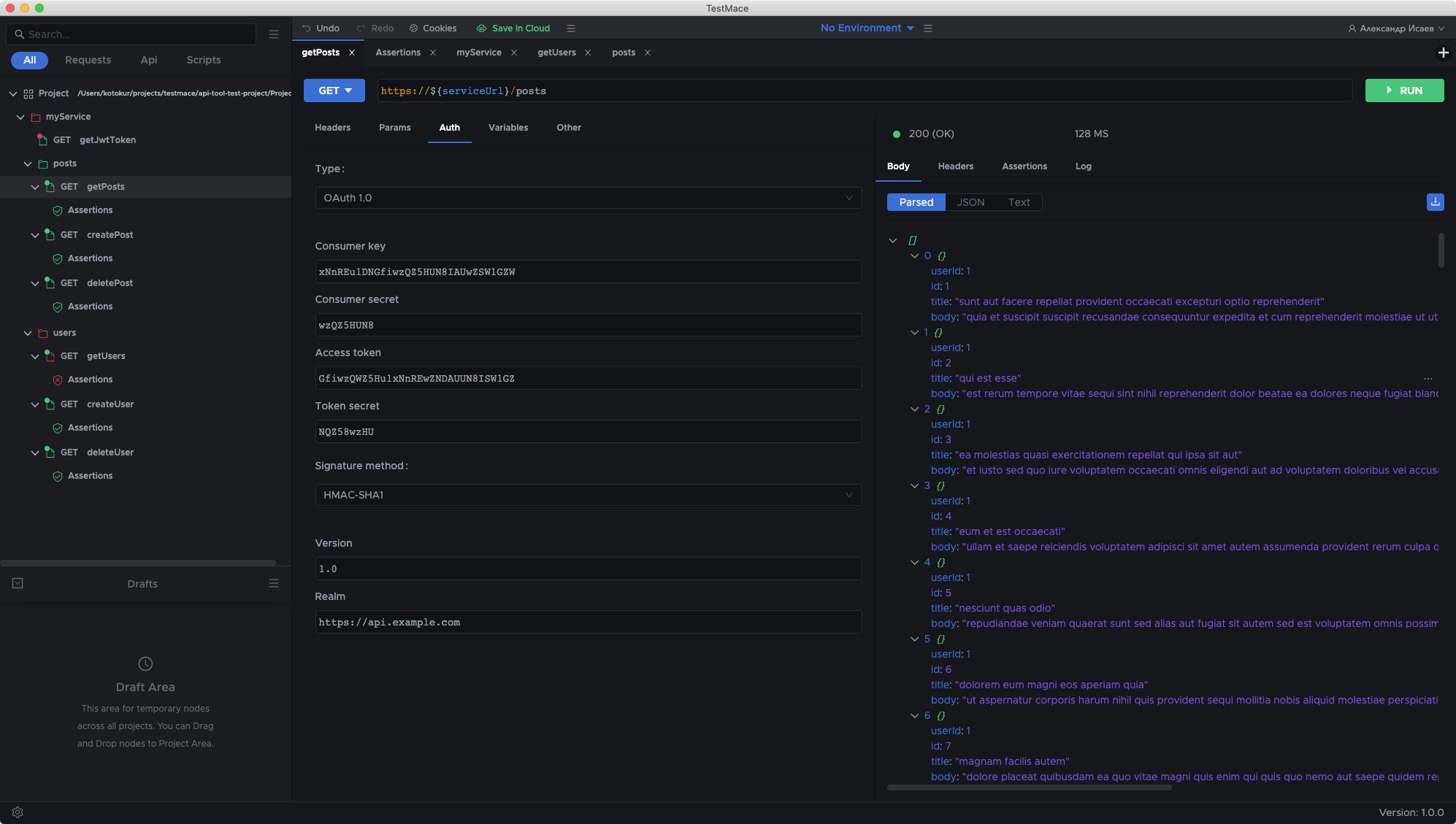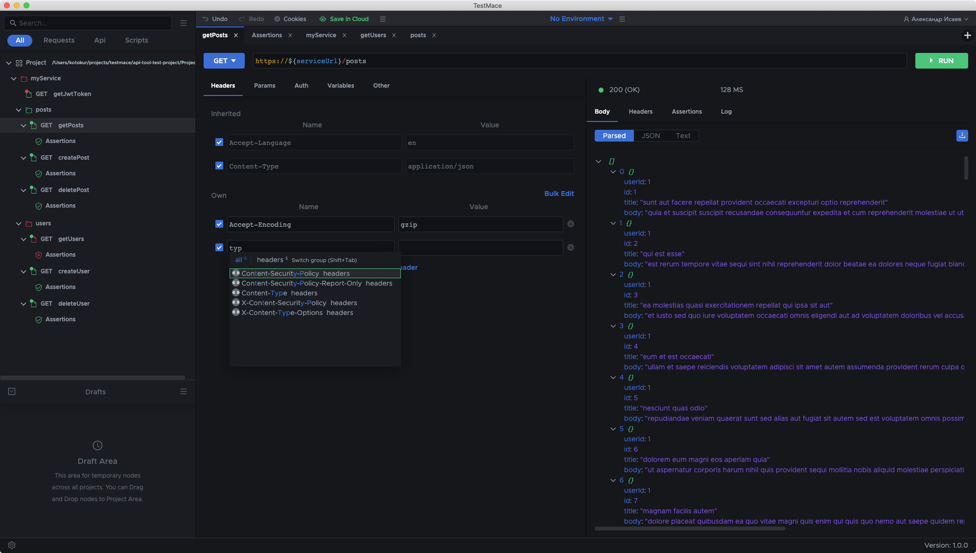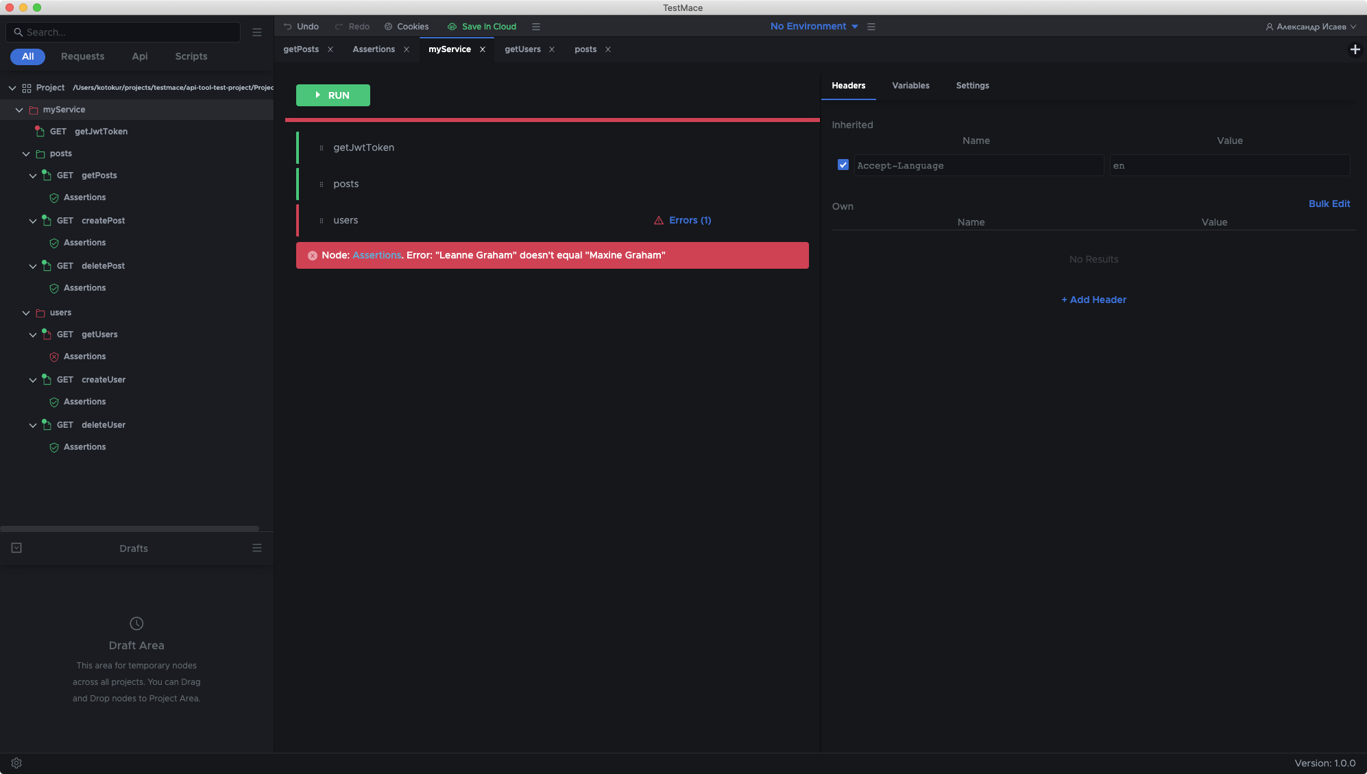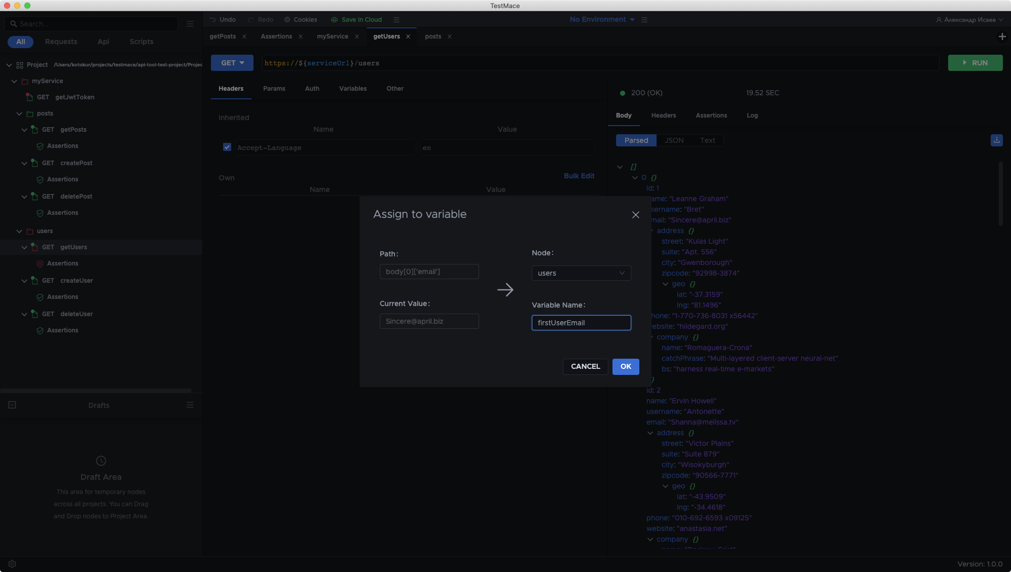 Assign a request result to a variable and get access from other nodes. Save authorization tokens, response headers or parts of a response body.