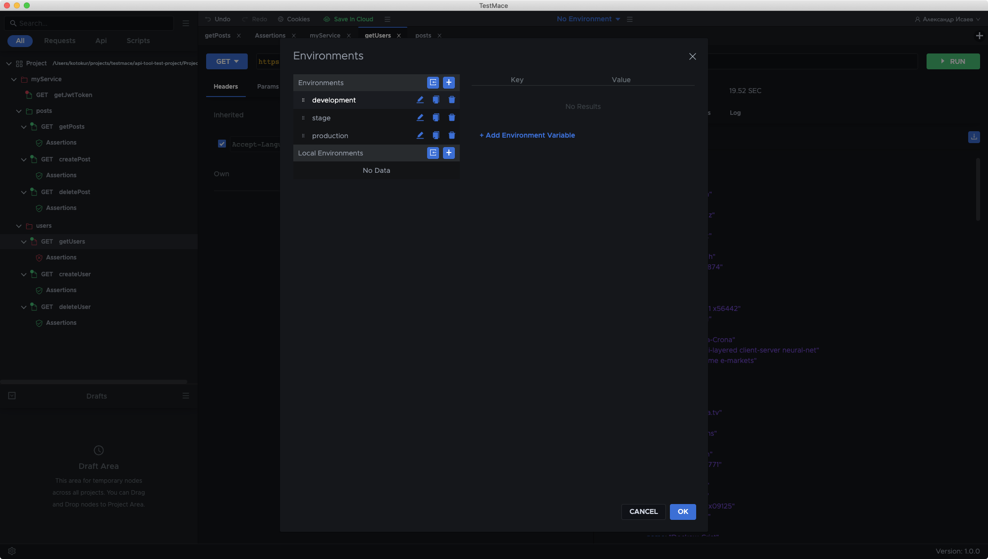 Run your scenarios in different environment contexts. Use this to organize development, stage and production environments.